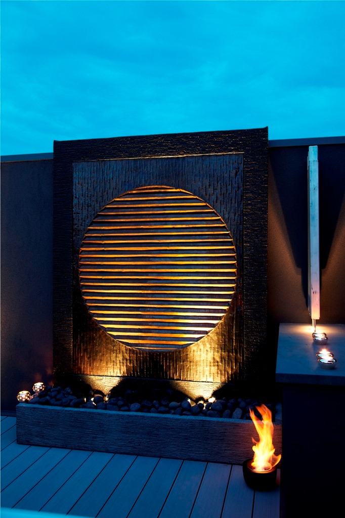 •The copper wall with stone pond base
