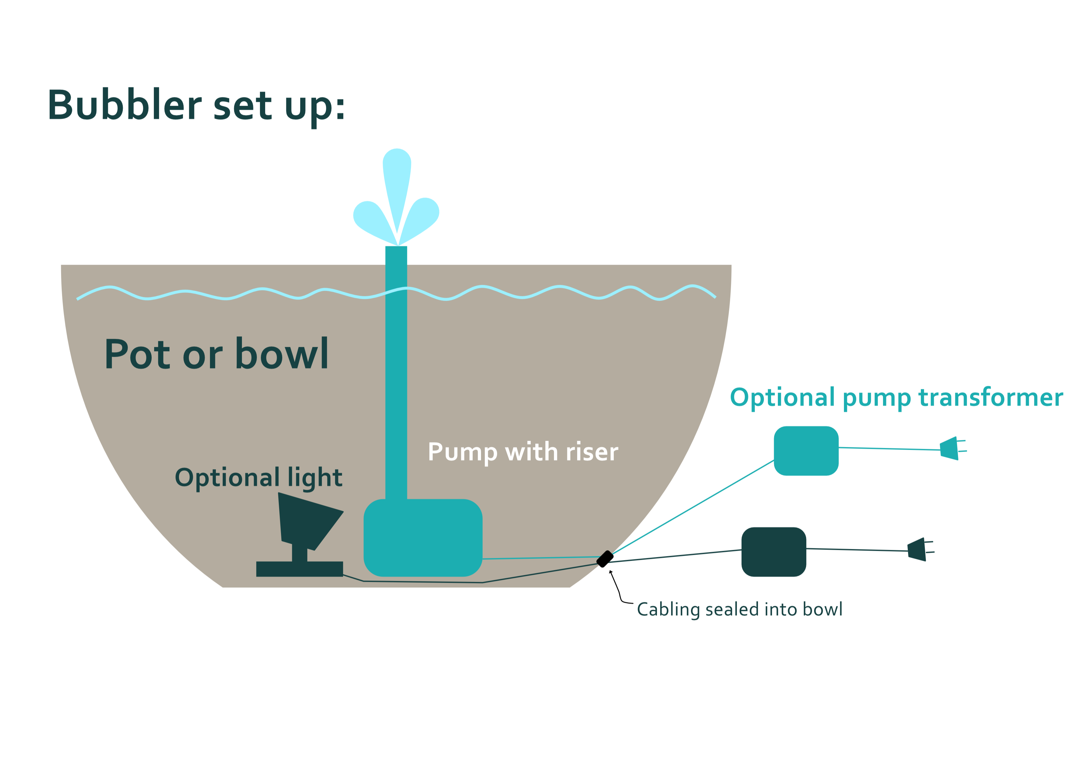 We can turn any of our bowls into beautiful bubbler features by adding a low voltage pump and optional lighting. The perfect low maintenance addition to your garden. Architectural bowl bubbler packages includes: bowl (style and size of your choice) , low voltage pump with transformer, prepared as bubbler (delivery not included)