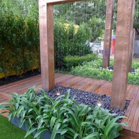 The ultimate centerpiece - this is the pinnacle of water features packages. Our Copper Rain Shower stands 2.0m tall and creates a curtain of rain between its frame. Available in Shiny or Antique copper finishes.