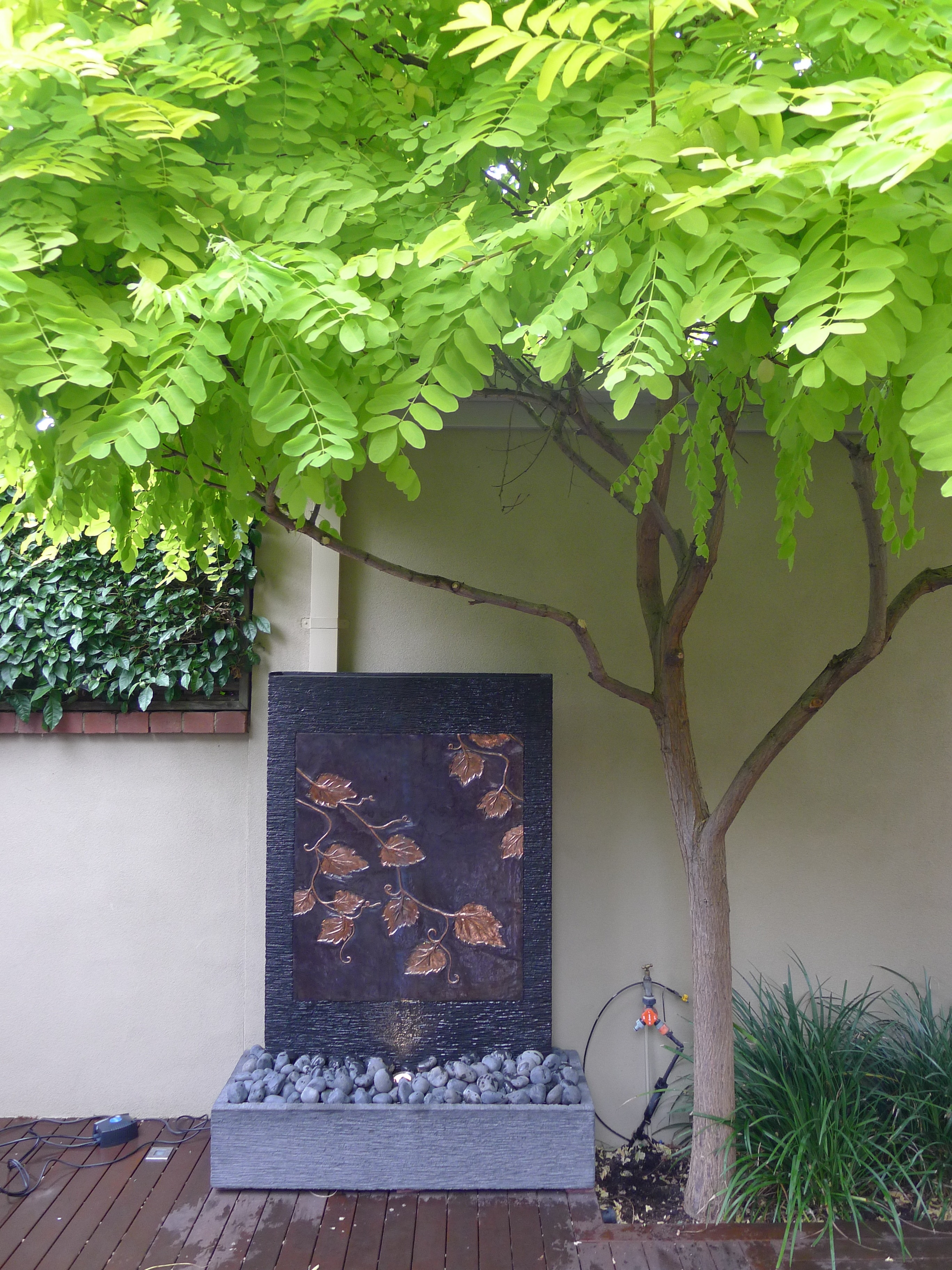 •The copper wall with stone pond base